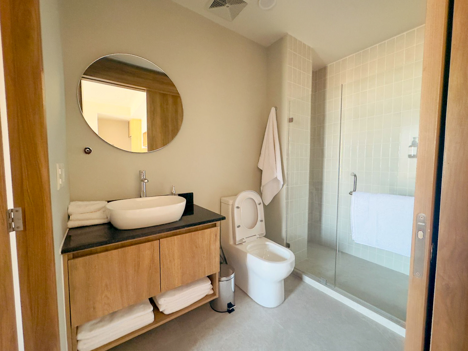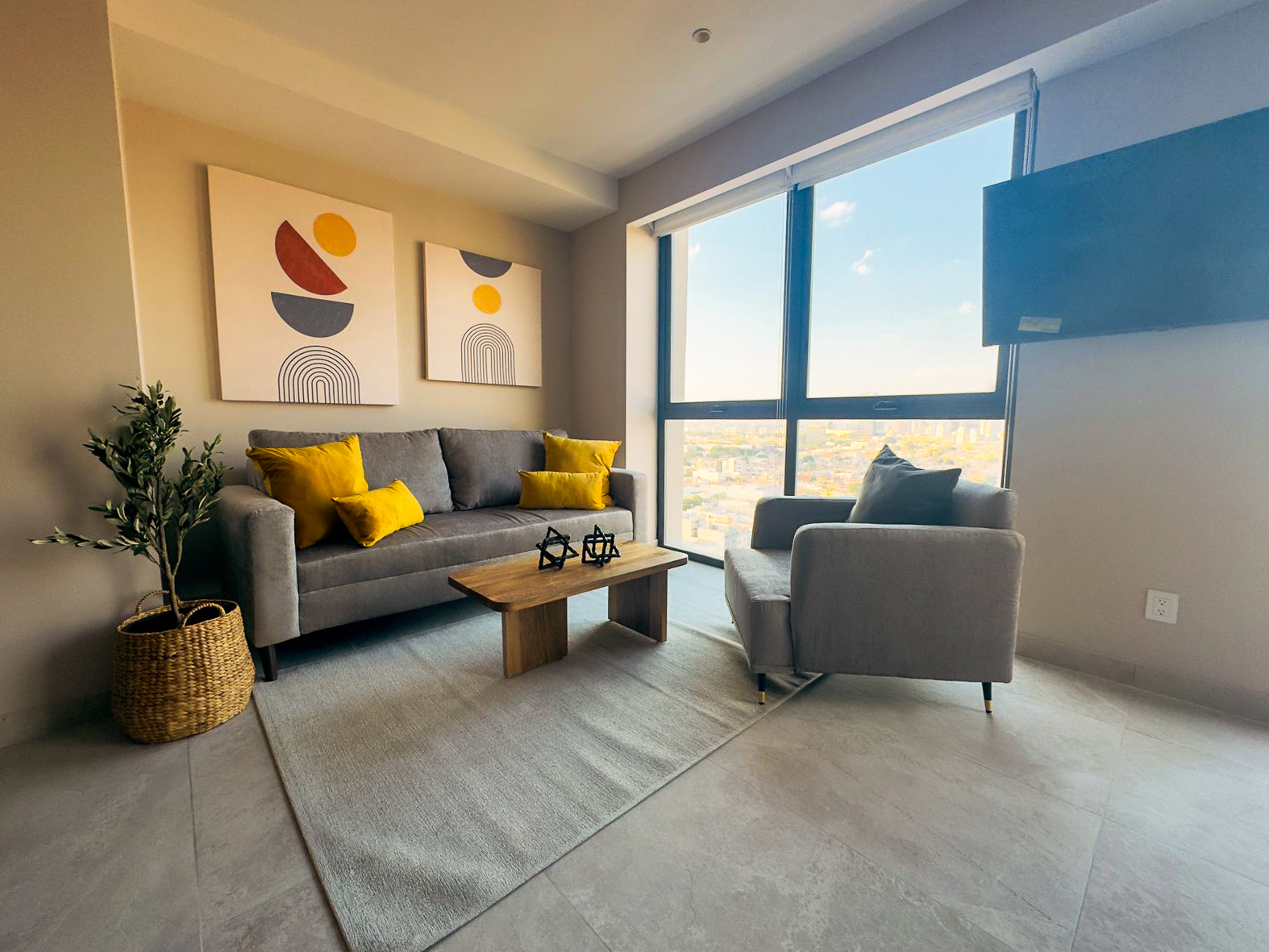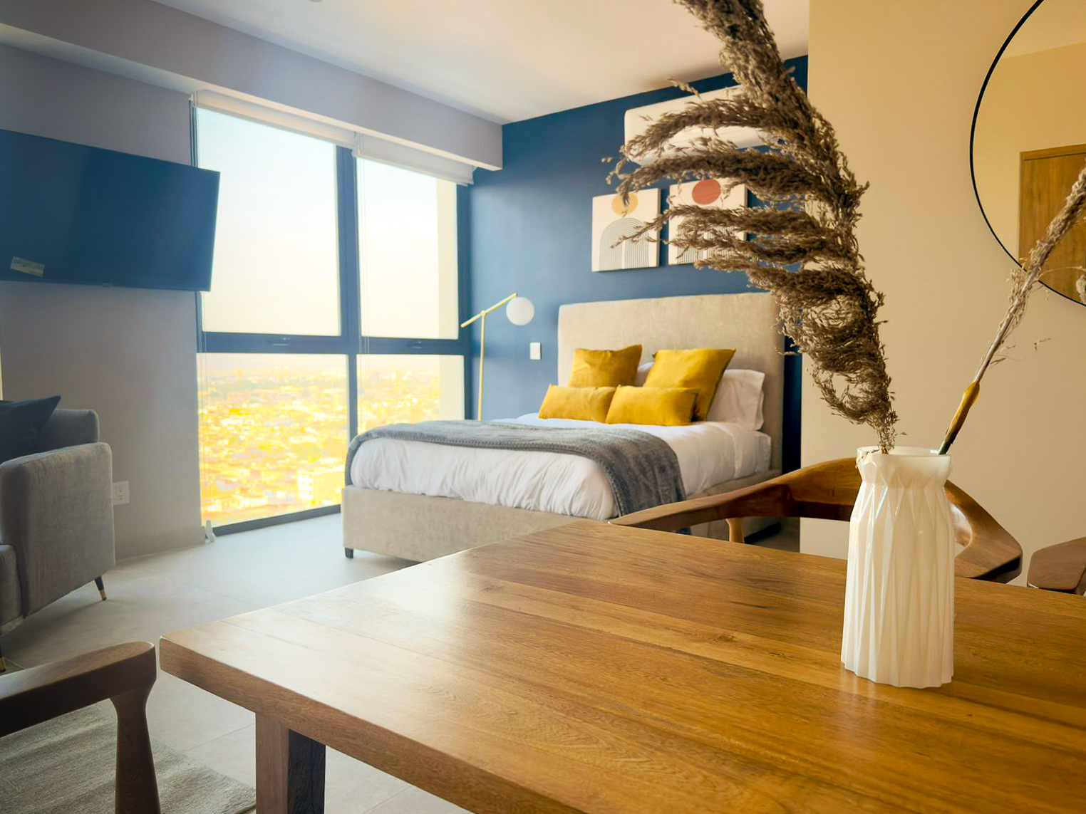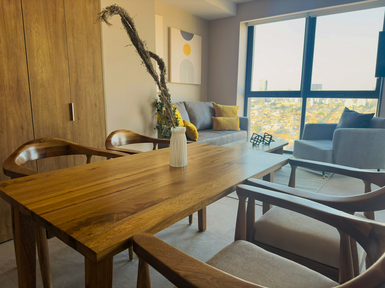 Este departamento destaca por su diseño minimalista y eficiente uso del espacio. Pensado para estancias cortas, combina confort y estética contemporánea. Los tonos neutros y los acentos en madera aportan calidez y equilibrio, mientras que cada elemento ha sido elegido para maximizar la funcionalidad sin perder elegancia.