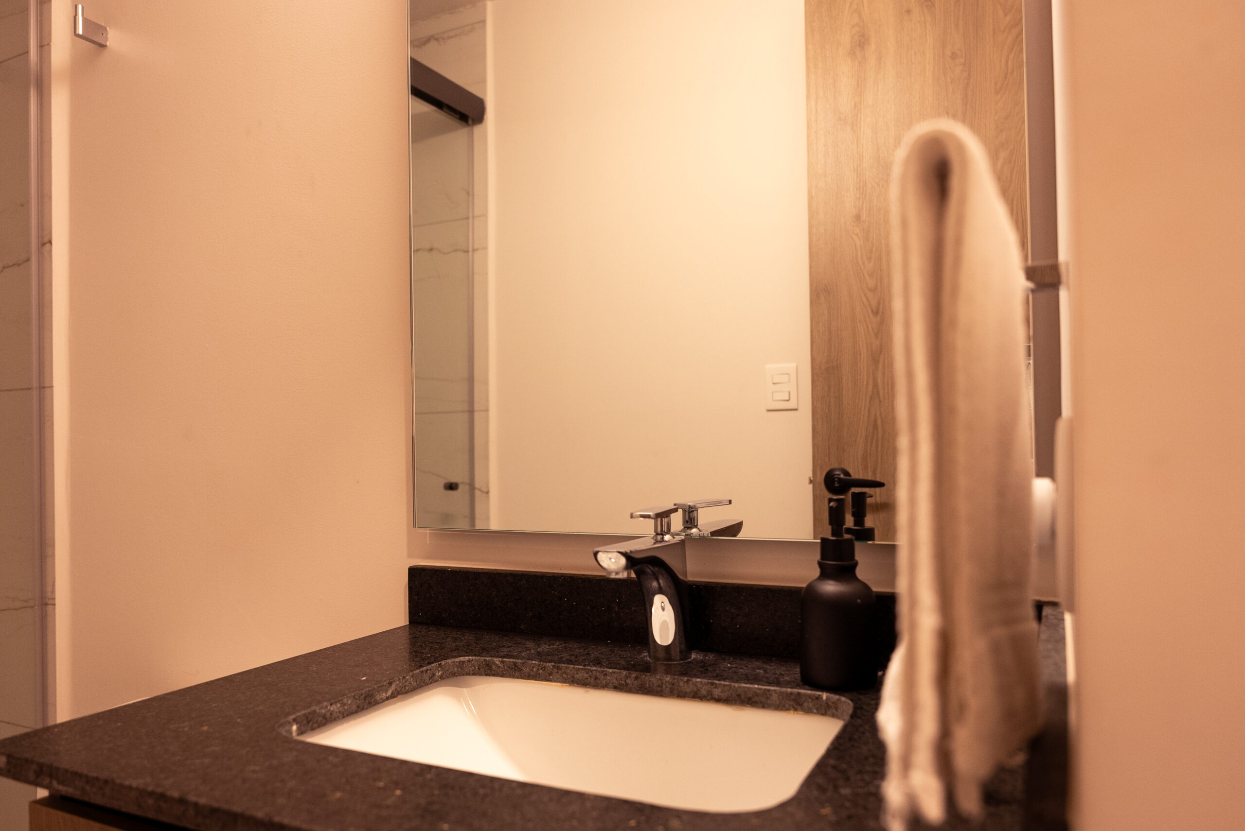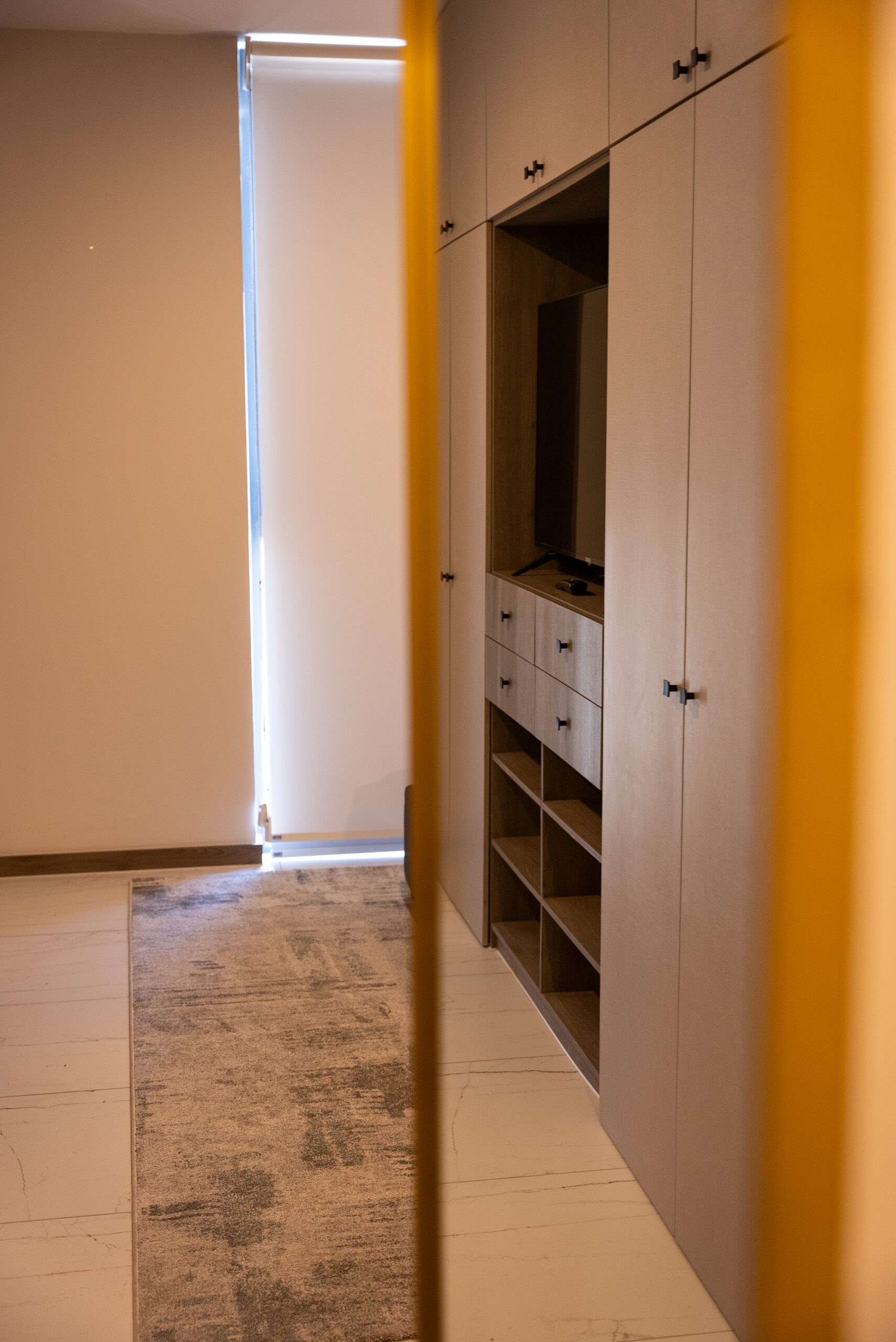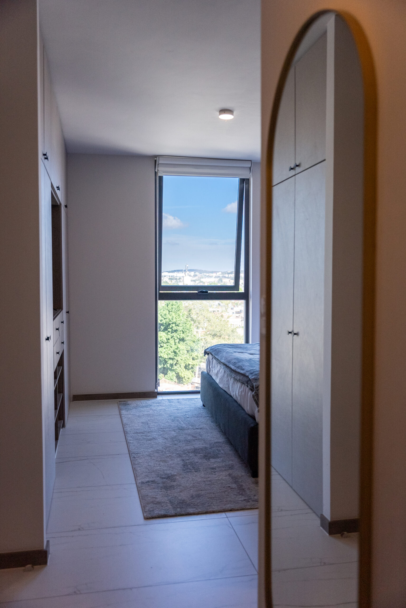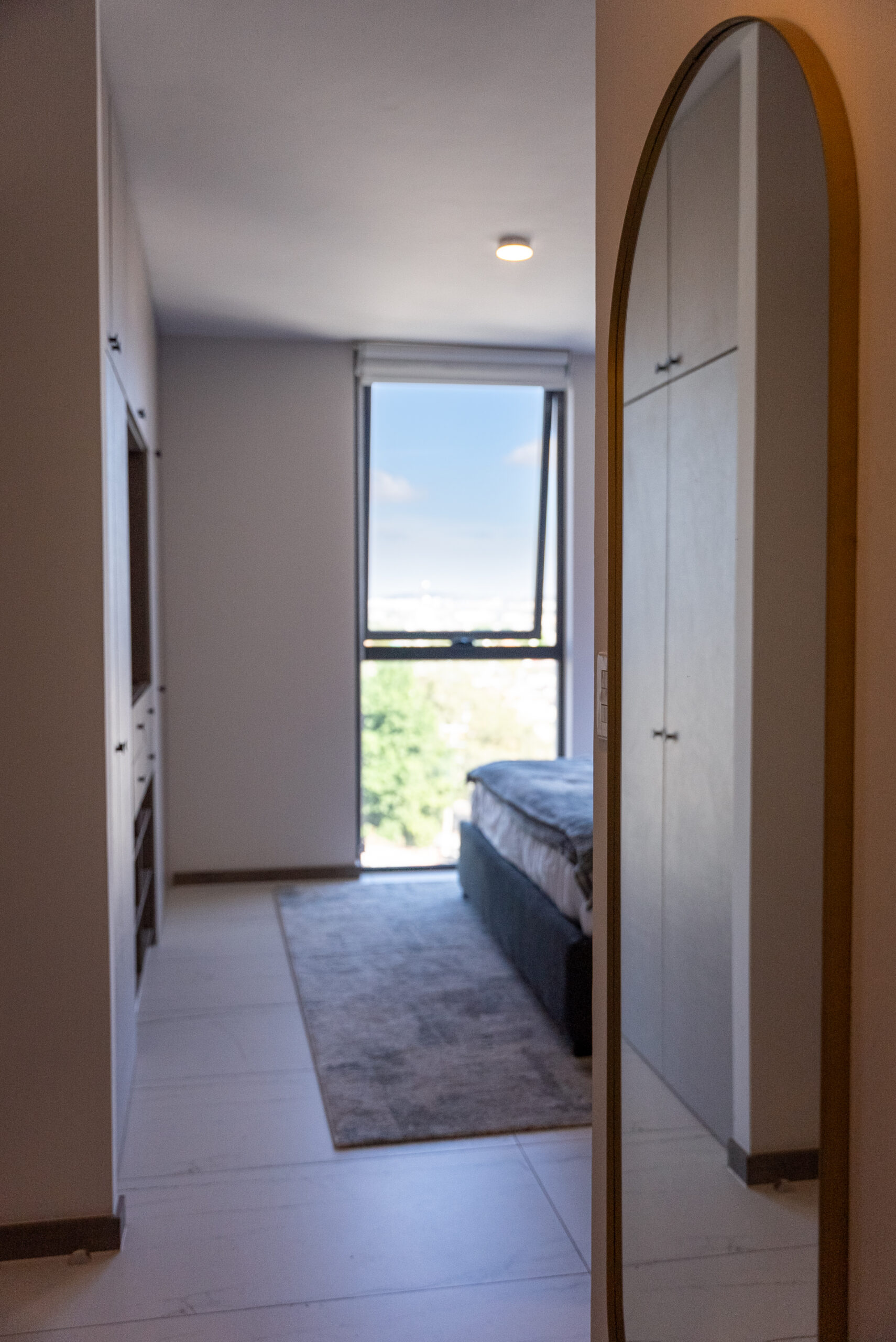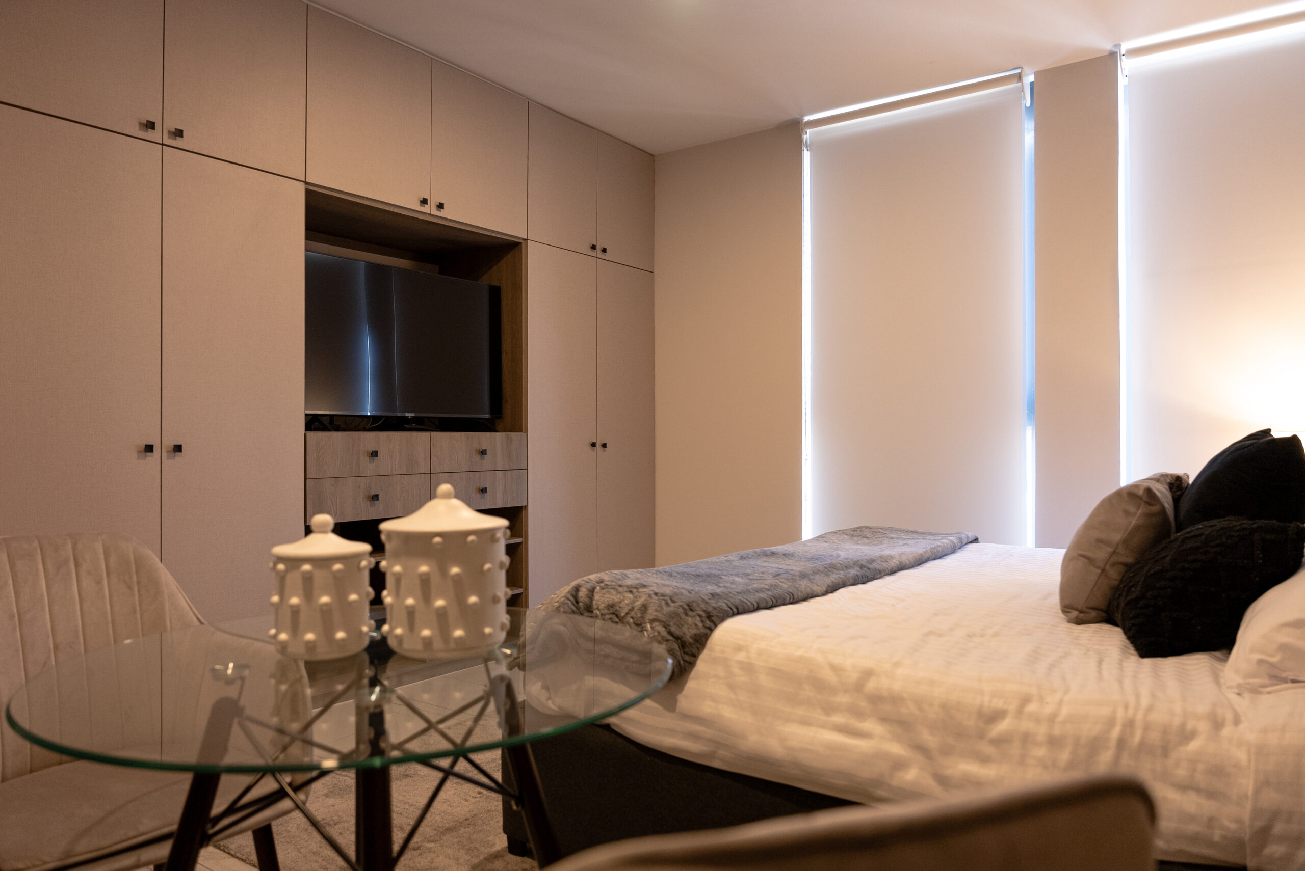 Departamento lock-off funcional con dos ambientes versátiles. Paleta cálida y elegante que aporta sofisticación y armonía, en sintonía con la arquitectura de la torre.
