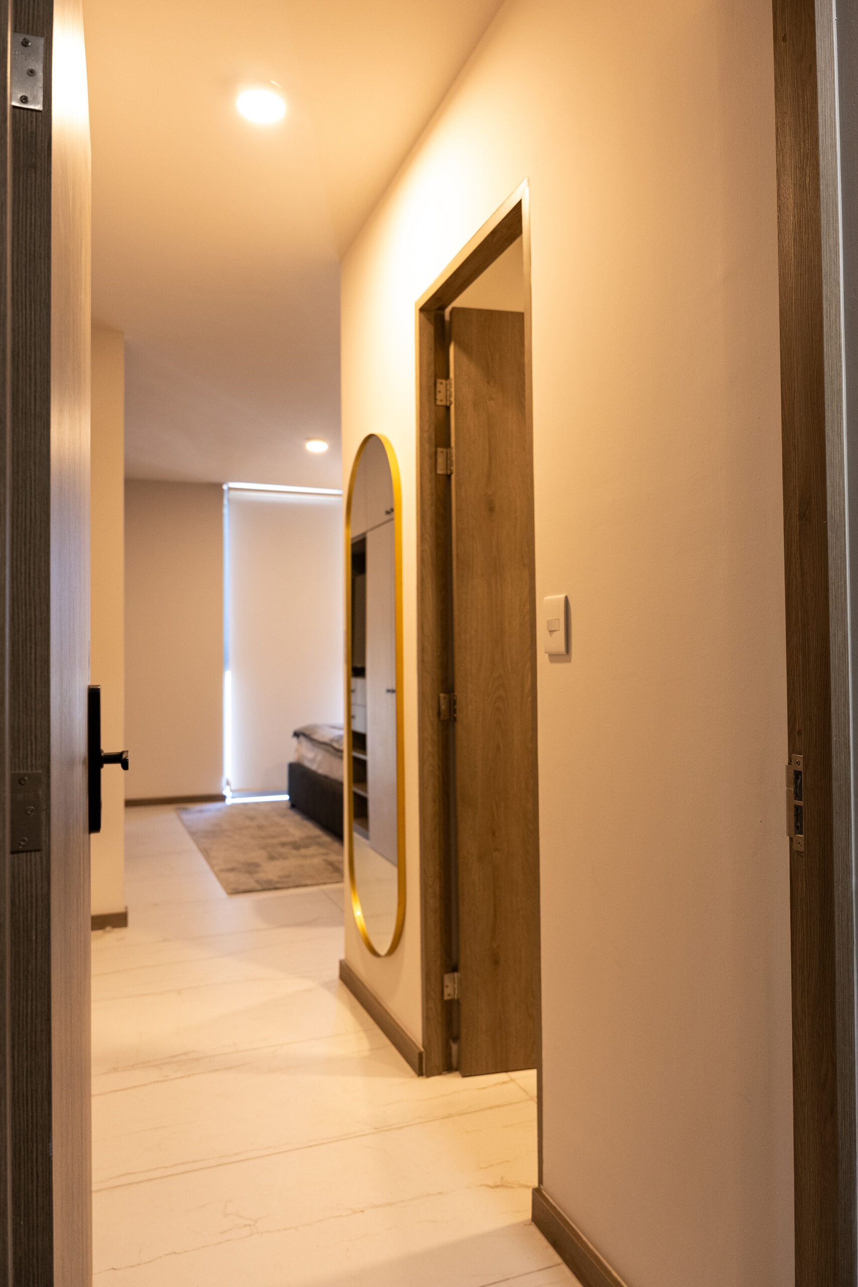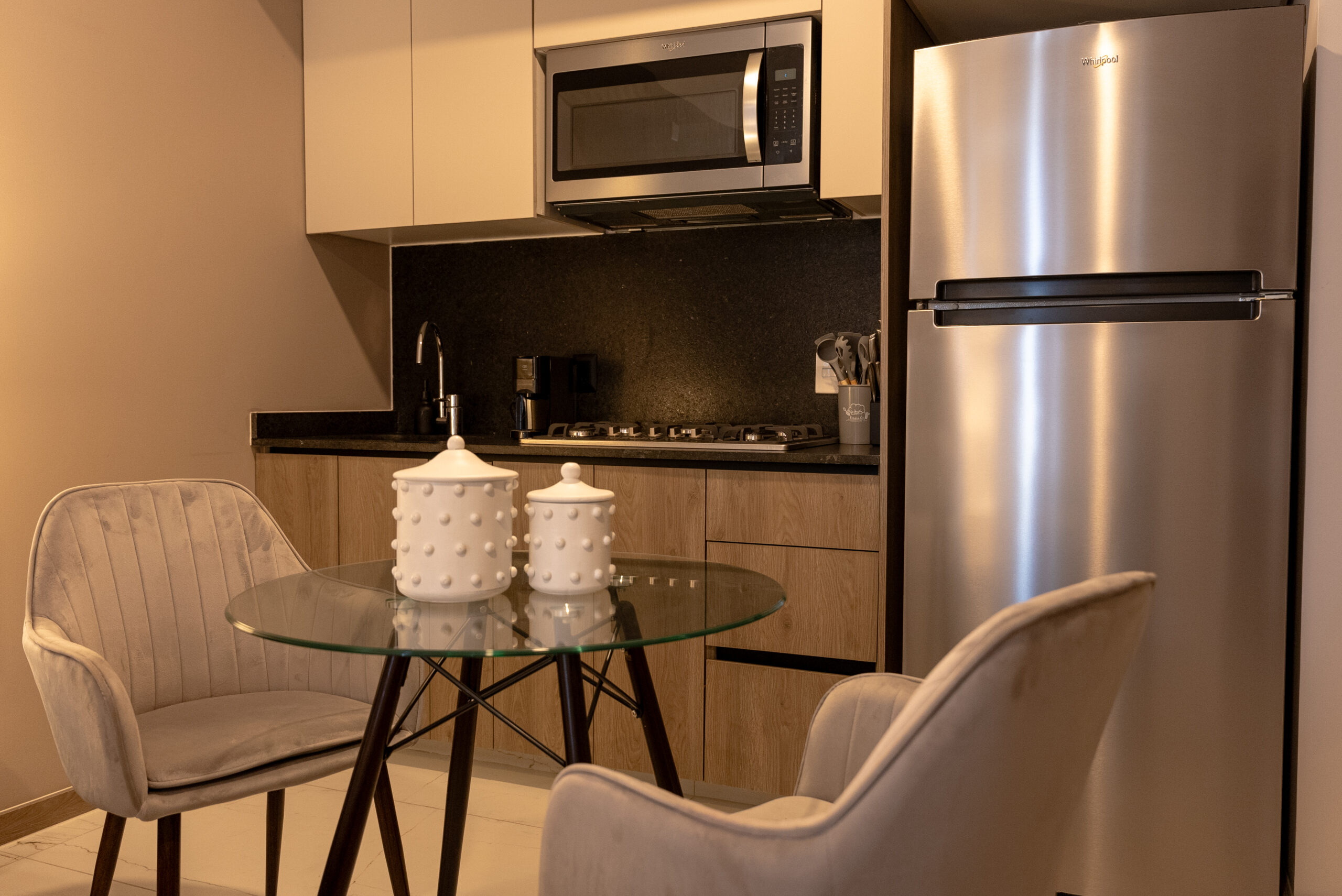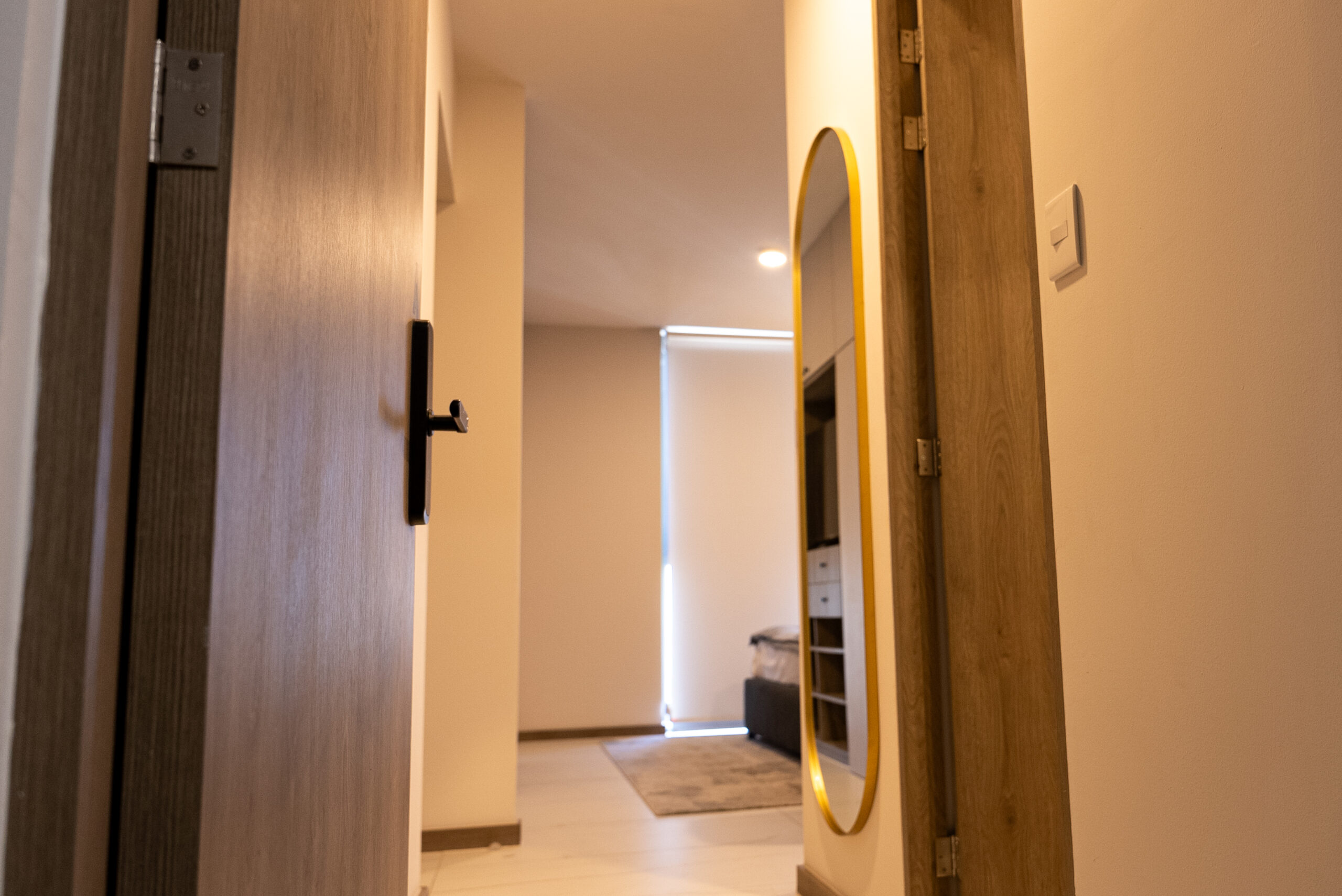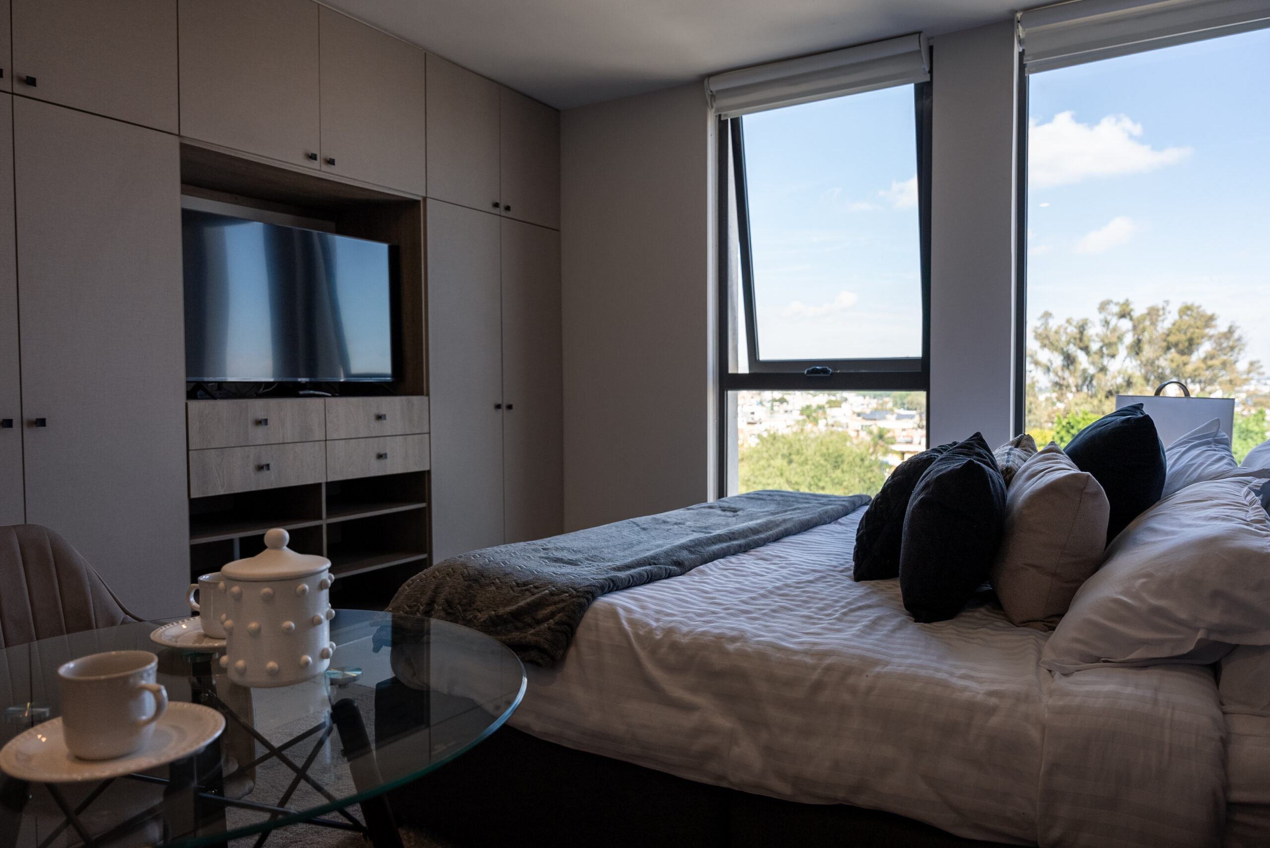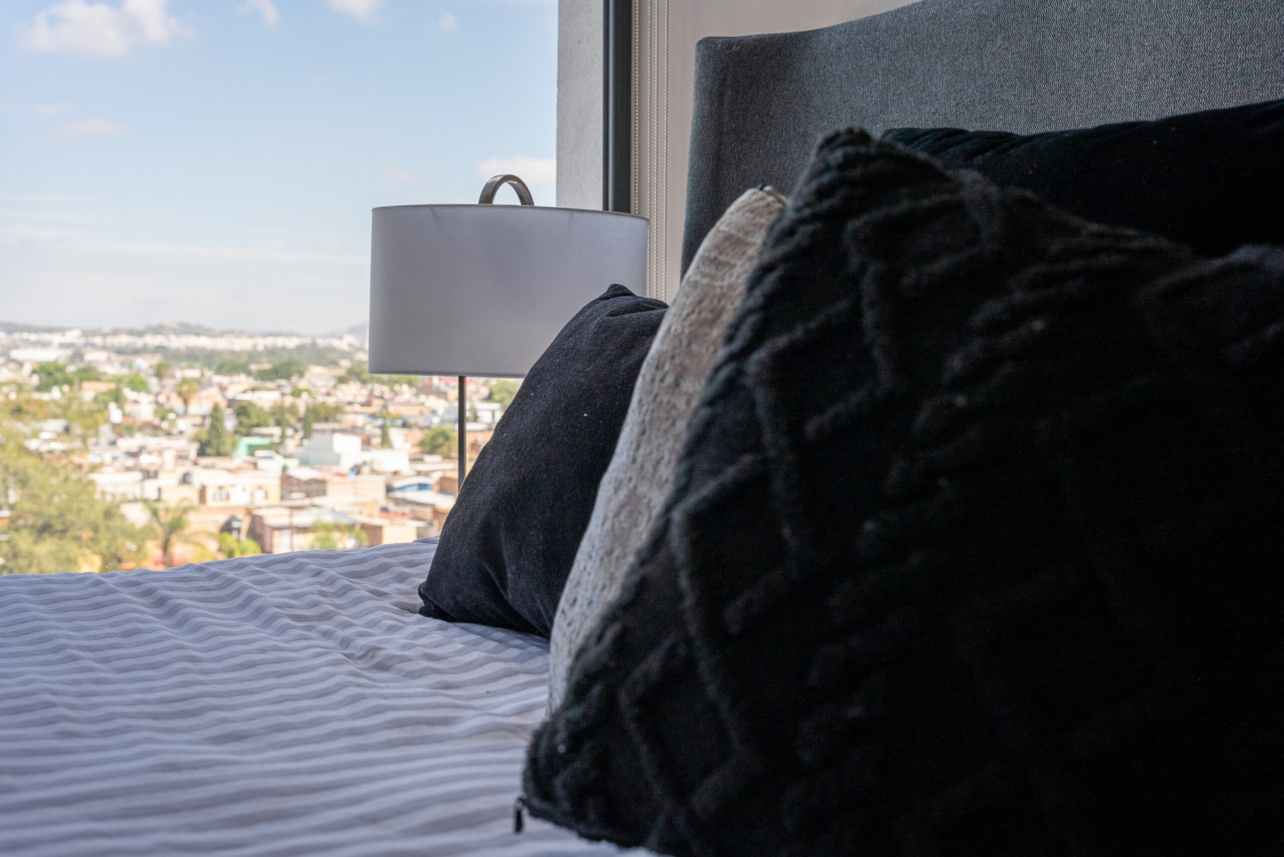 Departamento lock-off funcional con dos ambientes versátiles. Paleta cálida y elegante que aporta sofisticación y armonía, en sintonía con la arquitectura de la torre.